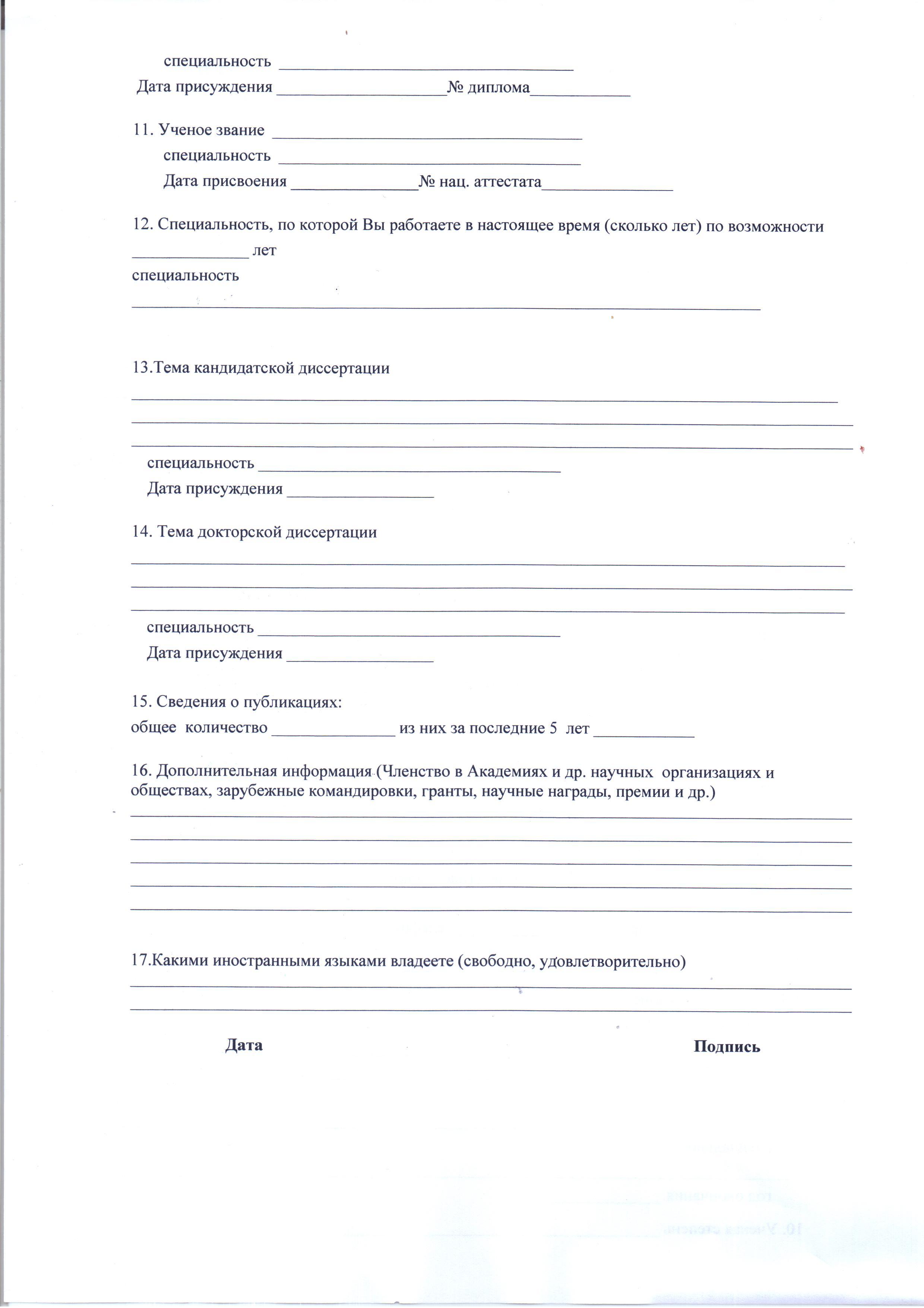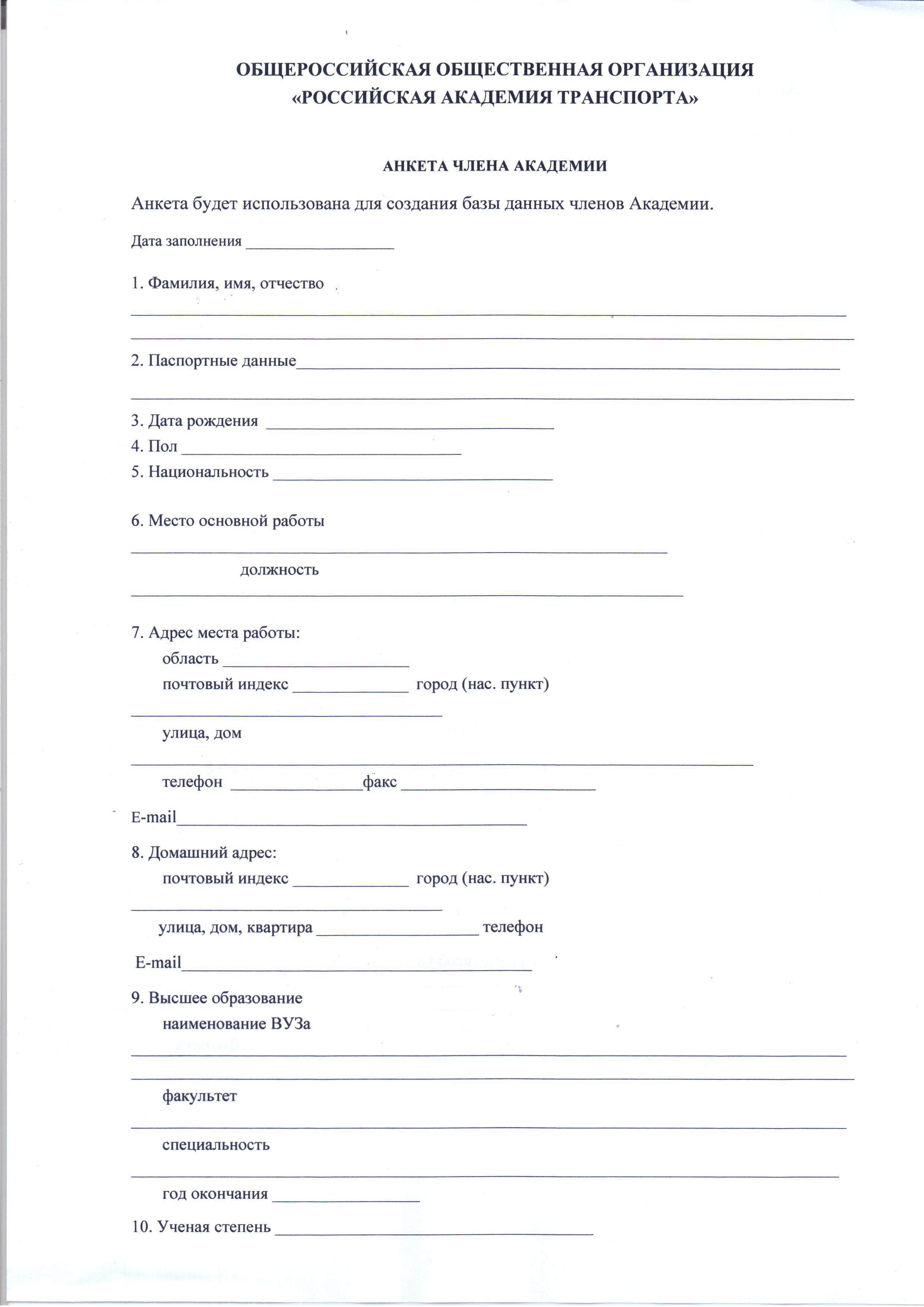 Анкета члена Общероссийской Общественной Организации "Российская Академия Транспорта" (стр. 1 , 2 )