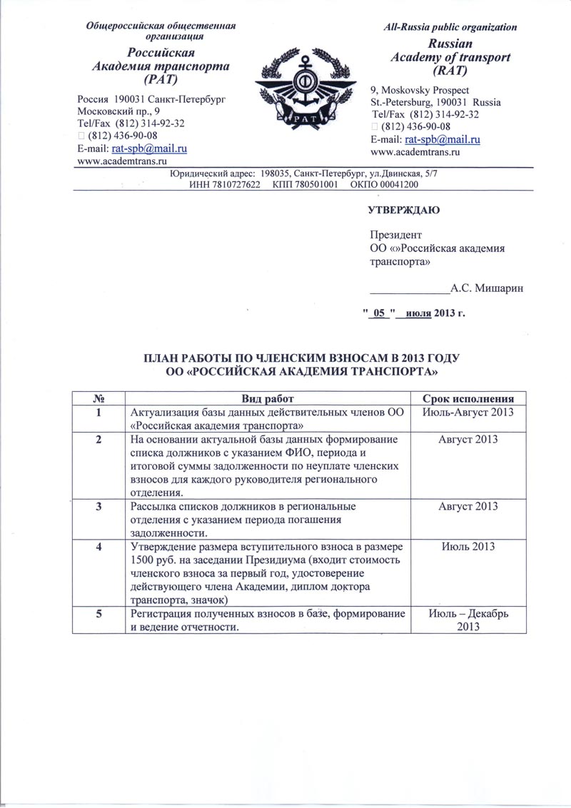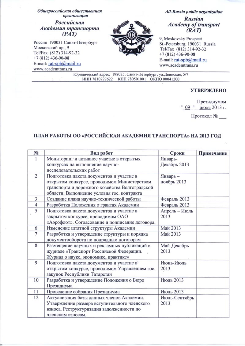 План работ ОО "Российская Академия Транспорта" на 2013 год (стр. 1 , 2, 3)